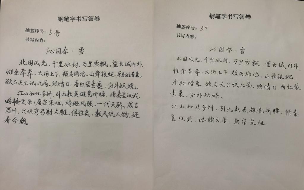 比赛开始前10分钟,参赛选手通过抽签决定上场顺序。30名选手共分为15组,每组2人。比赛开始,每组依次上台进行相关内容的黑板字板书展示,每个人的展示时间为5分钟。20点30分,下发试卷,参赛选手进行钢笔字正楷书写,10分钟后统一收卷。所有参赛选手都认真对待此次书法比赛。钢笔字展示结束后,三位评委对每位参赛选手的作品分别进行打分。经过评委老师的认真讨论,评选出了三等奖、二等奖、一等奖若干名。评委为获奖选手颁发荣誉证书,并与获奖选手合影留念。