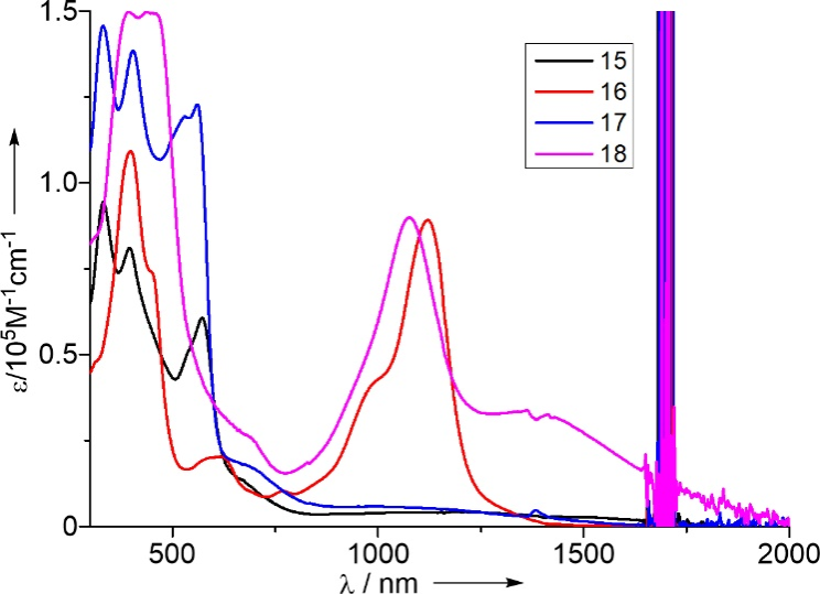 作者以orangarin的BF2配合物8为起始原料,通过多步反应成功合成了COT桥连3H-orangarin二聚体15。化合物15可被二氧化锰氧化生成2H-orangarin二聚体16(图3),核磁共振氢谱表明,化合物15中的两个orangarin单元仍保持各自独立的反芳香性;而化合物16的电子结构发生重大改变,分子中的两个orangarin失去了原有反芳香性,理论计算证实了该推断,化合物16中的orangarin单元表现出非芳香性特征,且该分子中心处的吡咯并COT单元形成了14π电子的抗磁环电流,具有芳香性特征。作者加二氧化锰当量并延长反应时间,可使化合物16进一步发生分子间的氧化偶联反应生成2H-orangarin四聚体18。化合物18经硼氢化钠还原可以得到3H-orangarin四聚体17。研究表明3H-orangarin四聚体17与15类似,其四个orangarin单元仍保持各自独立的反芳香性;而2H-orangarin四聚体18中四个orangarin单元为非芳香性大环,且分子中间的两个吡咯并COT环单元形成了两组独立的14π电子的抗磁环电流,具有反芳香特征。紫外可见近红外吸收光谱显示,化合物15和17具有反芳香性的特征吸收,与它们核磁共振氢谱和理论计算结果相符合;化合物16和18的在近红外区域具有强的吸收(图4),这可能是由于化合物16和18可通过其分子内的COT桥基进行有效的π电子离域所导致的。此外,研究发现Orangarin低聚物15-18均具有多重可逆氧化还原电位以及非常快速的激发态衰变。