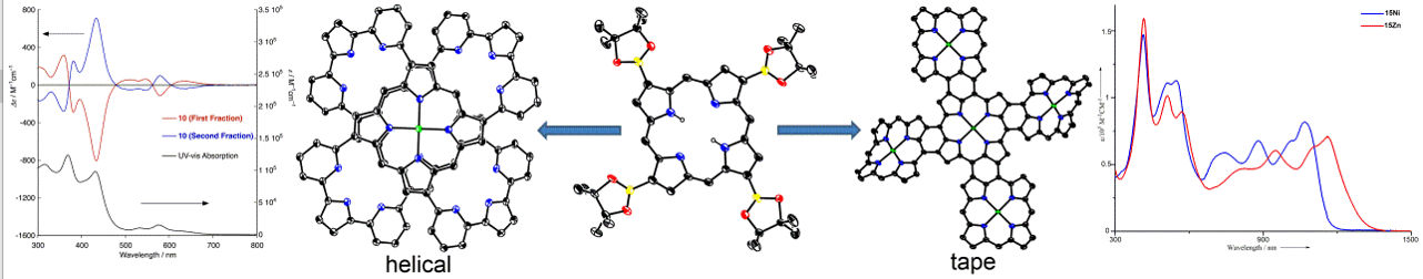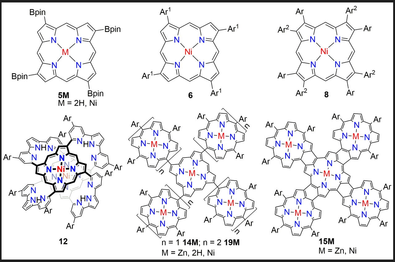 该研究团队将Ir催化的硼化反应成功应用在卟吩上,得到2,7,12,17-四频哪醇硼酸酯取代的卟啉自由碱5H,其与乙酰丙酮镍反应可得到相应的镍卟啉5Ni. 5Ni是一种用途广泛的合成子:该团队以5Ni为原料,成功构筑了四芳基取代的卟啉6、八芳基取代的卟啉8、四桥相连的手性面对面卟啉二聚体12、十字形卟啉五聚体14M和卟啉九聚体19. 其中十字形卟啉五聚体14可以进一步氧化稠合,得到相应的卟啉纳米带15M。