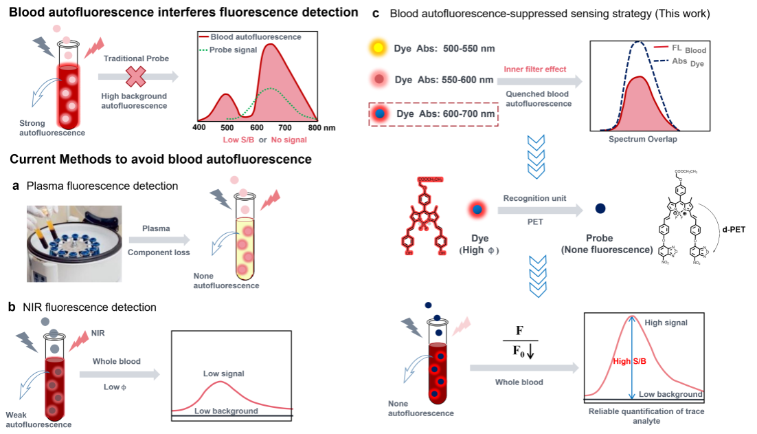 血液是全身运输和交流的载体,准确分析血液中内源性物含量的变化具有重要意义。然而,现有的荧光探针很大程度上受到血液自荧光的干扰,导致低信背比或者荧光信号被血液自荧光覆盖。因此现有的血液荧光检测均是在血浆中进行,高速离心去除红细胞层会导致血液成分的缺失,导致检测结果不准确。