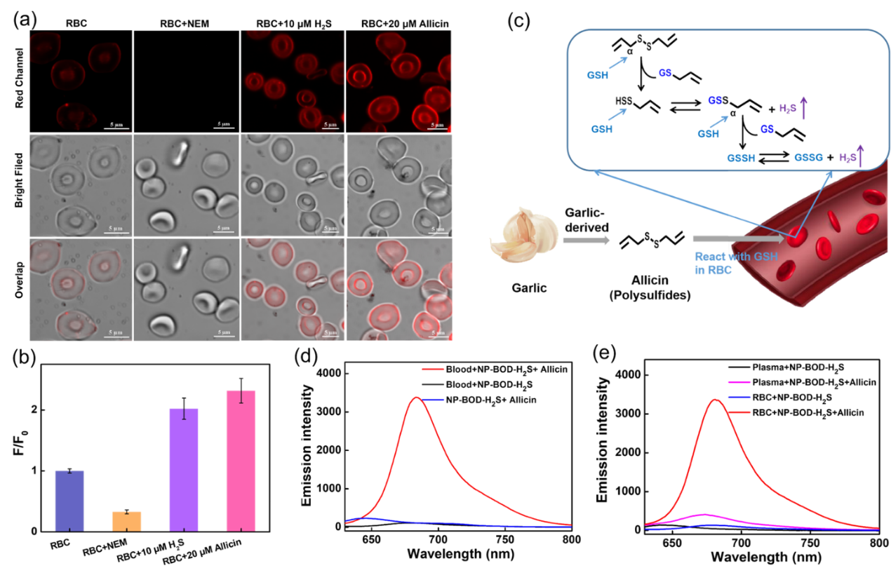 图2.红细胞共聚焦荧光成像图以及大蒜素刺激红细胞产生H2S现象的研究