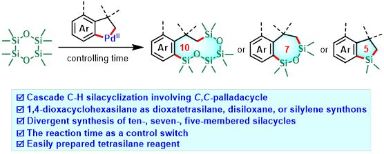 在前期研究基础上,该课题组近期发现了一种四硅烷(ODCS)用于时间控制的钯催化C-H活化发散性合成硅杂环化合物的方法。该反应利用ODCS试剂捕获五元C,C-环钯物种,以反应时间为控制开关,可实现丙烯酰胺、2-卤代-N-甲基丙烯酰苯甲酰胺和2-碘联苯三类不同底物的转化,从而选择性合成了不同环尺寸的硅杂环化合物,包括十元、七元、五元硅杂环化合物。作者对反应机理进行了较为详细的研究:合成了环钯络合物,并验证了该中间体的存在;通过核磁跟踪、气相质谱实时监测等手段验证了十元、七元、五元硅杂环化合物的转化关系及可能的途径。