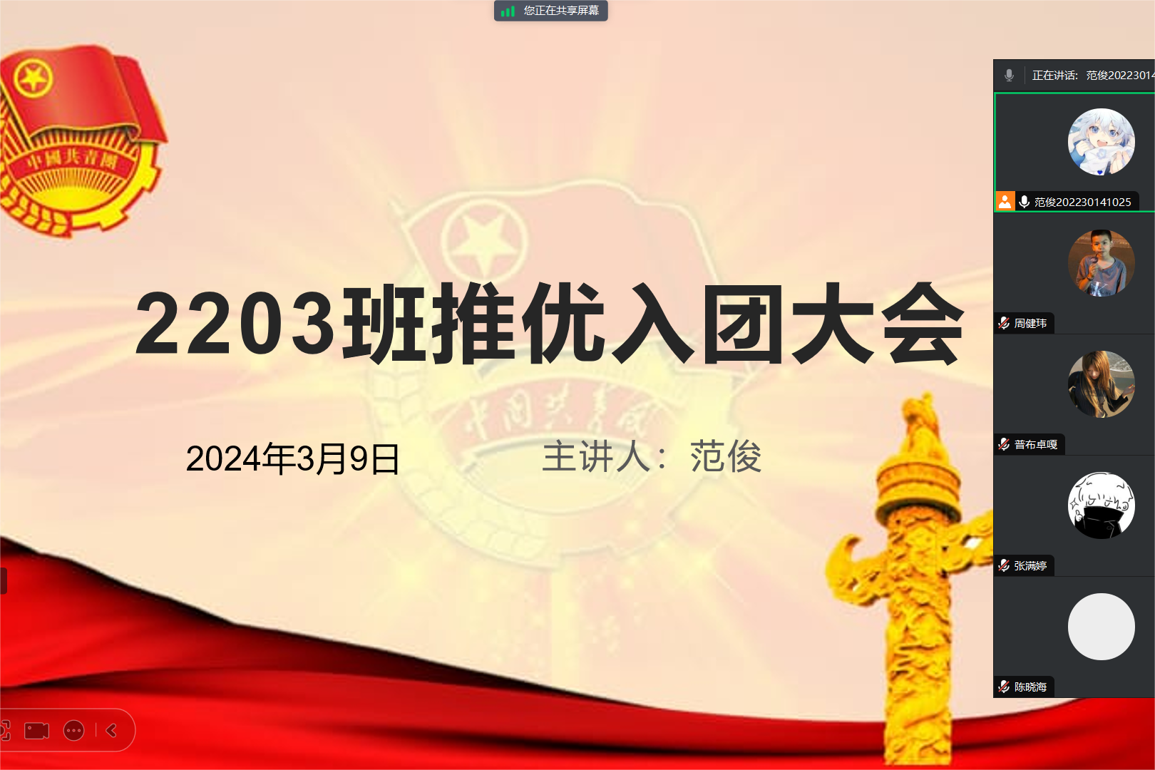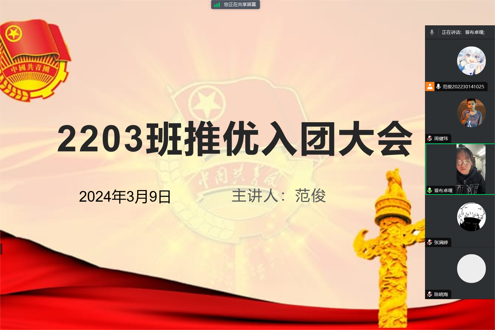 (通讯员 范俊)3月9日晚上21时,2203班团支部在腾讯会议开展了线上推优入团支部大会。此次班会共48名同学出席,其中5名同学参与了班级推优评选并均获得了推优入团资格。