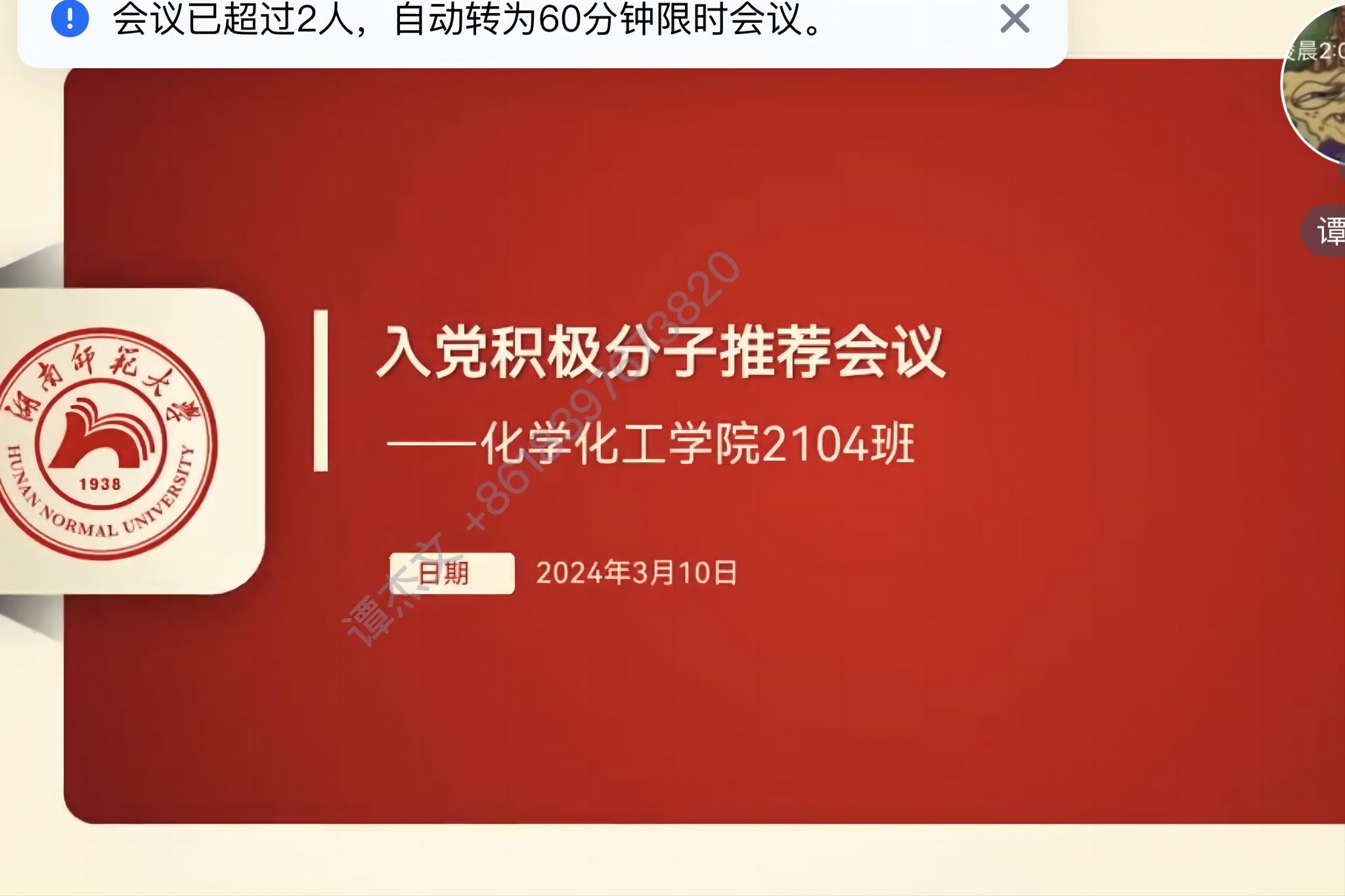 (通讯员 王宇杨)为增强同学们的党性意识和责任感,引导大家树立正确的人生观、价值观,努力成为社会主义建设者和接班人,激励更多同学积极向党组织靠拢并争取成为合格的共产党员,2104班于3月10日21时以线上会议形式组织开展入党积极分子推优会议,会议由班长王宇杨主持。