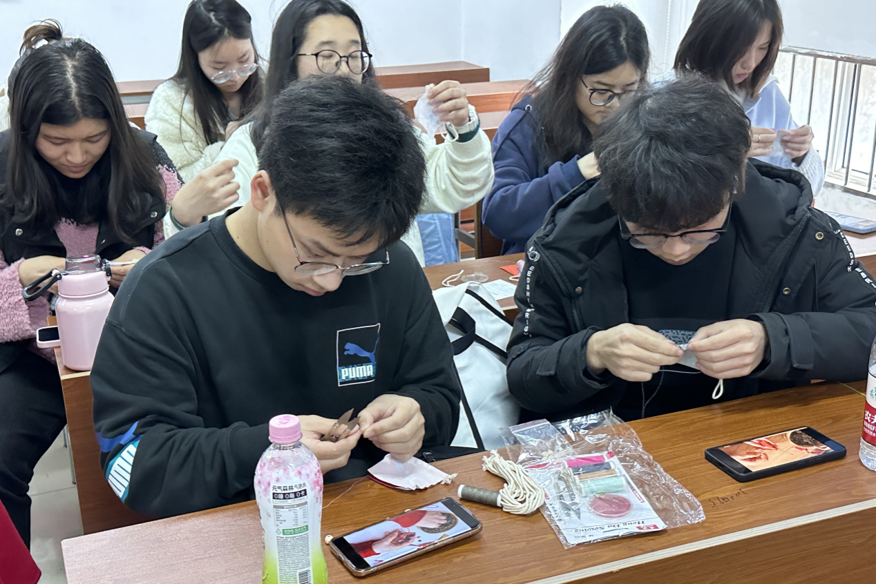 活动伊始,周思洁向参与人员介绍香囊的起源,为师生讲解制作香包的基本流程和此次香包制作所用到的十种香料——迷迭、香桂花、薄荷、檀香粉、香茅草、洋甘菊、金银花、柚子花、丁香和茉莉花。通过讲解,师生了解到通过不同的组合,搭配出来的香包分别具有驱蚊防虫、驱寒止痛、清热利湿等不同功效。最后,师生挑选出心仪的香包袋,仔细缝合后将喜好的香料填入袋中完成属于自己的作品。在穿针引线中,师生切身体会到手工制作香包的乐趣,对中国优秀传统文化有了更直接、深刻的了解。