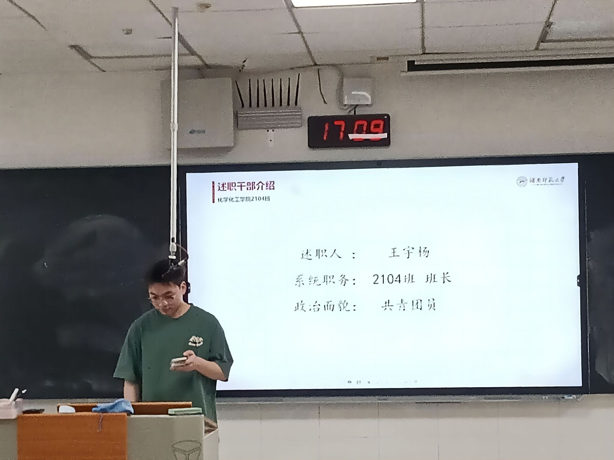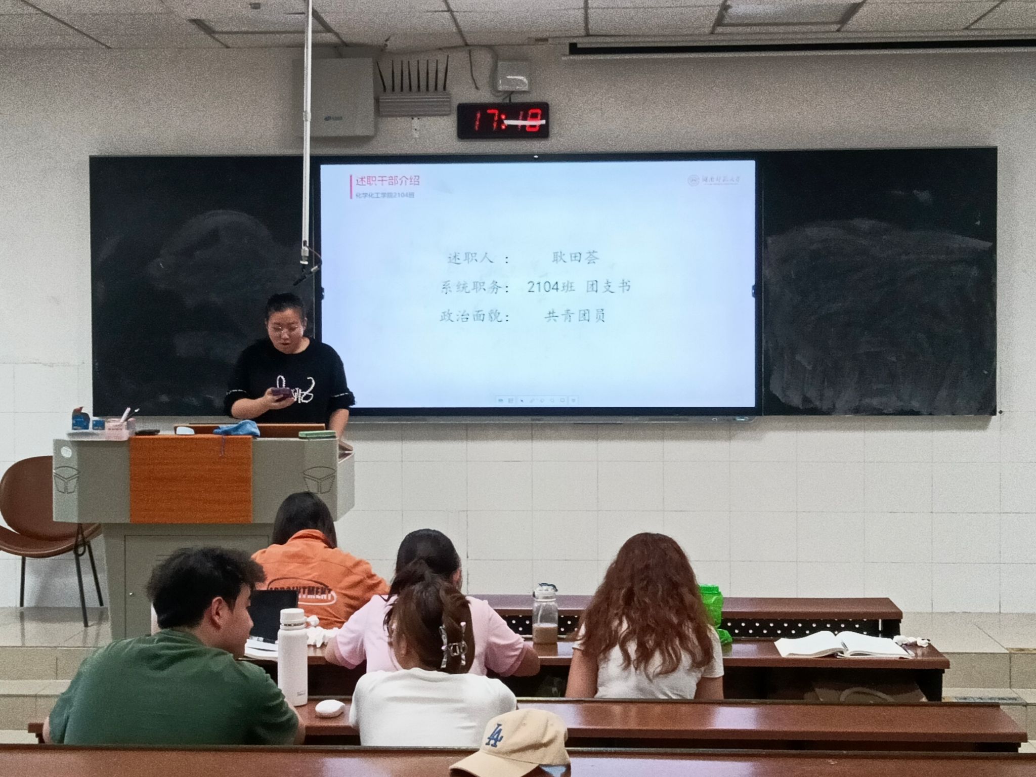 此次会议由述职干部介绍、干部述职和民主评议三部分组成,班长王宇杨、团支书耿田荟、组织委员孙静涛、宣传委员张爱和青协委员徐如意依次上台发言述职,向同学们介绍了2023-2024学年的工作和成果。参会同学根据述职报告对他们进行线上民主评议后此次班会正式结束。