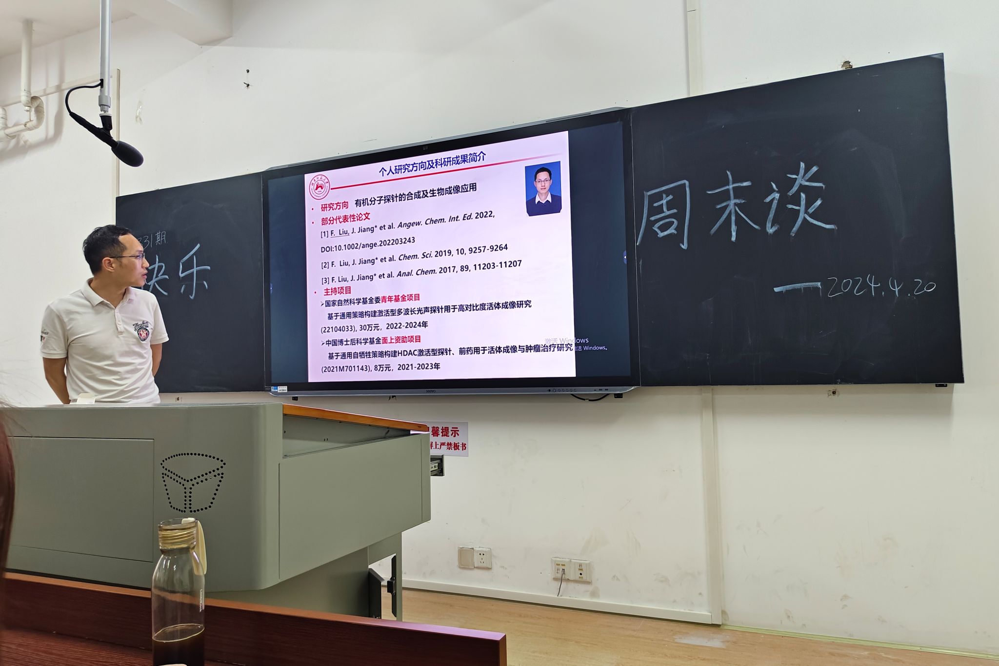 活动伊始,刘锋简单为同学们介绍了自己的个人研究方向和科研结果。通过刘锋对化员工物学的基本介绍,同学们得知在化员工物学的视角下,生物生体中有机分子的变化和与人类的疾病息息相关。而由于人类所不可避免的疾病,化员工物学的相关研究只会越来越为科学界所重视,因此也更值得更专业地学习。在聆听刘锋的讲解时,同学们了解到刘锋的研究团队主要是研究实用性的物品,比如临床例子ICG染料,这些染料可以用于确定人体中某些疾病的具体病灶点,这些与同学们都息息相关的研究无不激励着同学们积极投身科研事业。刘锋希望同学都能够了解化员工物学,如果对他的研究方向感兴趣的同学也欢迎参与到他的研究团队当中。