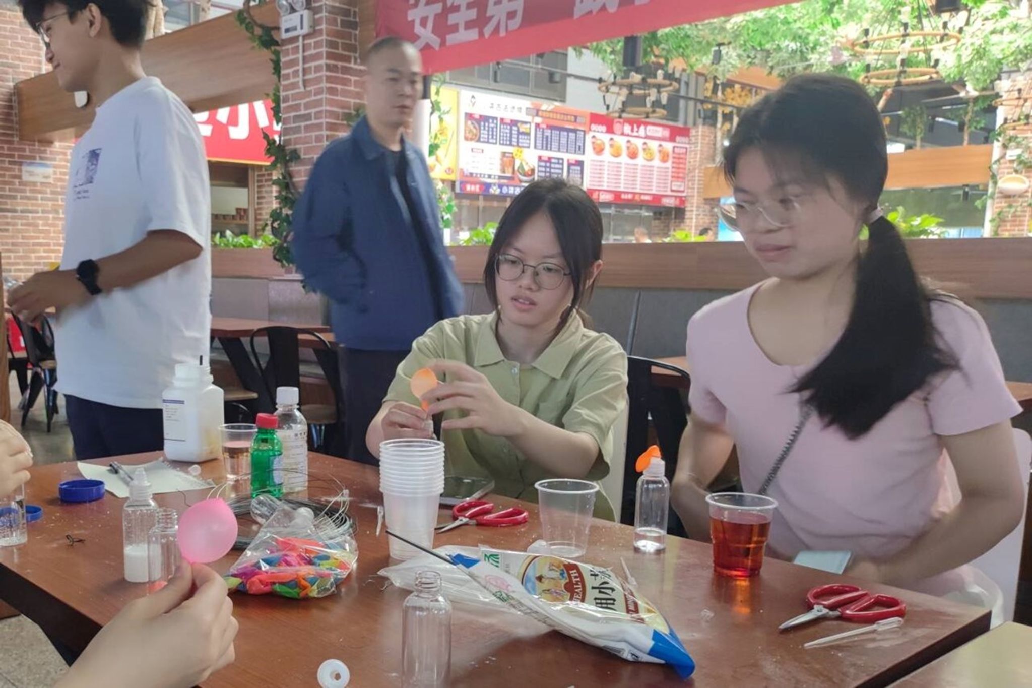 流血的心实验中,会员们配置酸化后的硫氰酸钾溶液,加入过氧化氢后充分搅拌,再将铁丝放入溶液并静置。会员们通过观察铁丝在溶液中反应的现象,思考反应原理,了解三价铁与硫氰酸钾络合的反应。在吹气球实验中,会员们将小苏打和柠檬酸溶液混合,利用其反应生成的二氧化碳气体“吹”气球。会员们通过实验了解日常生活中的化学试剂,感受化学实验独特的魅力。