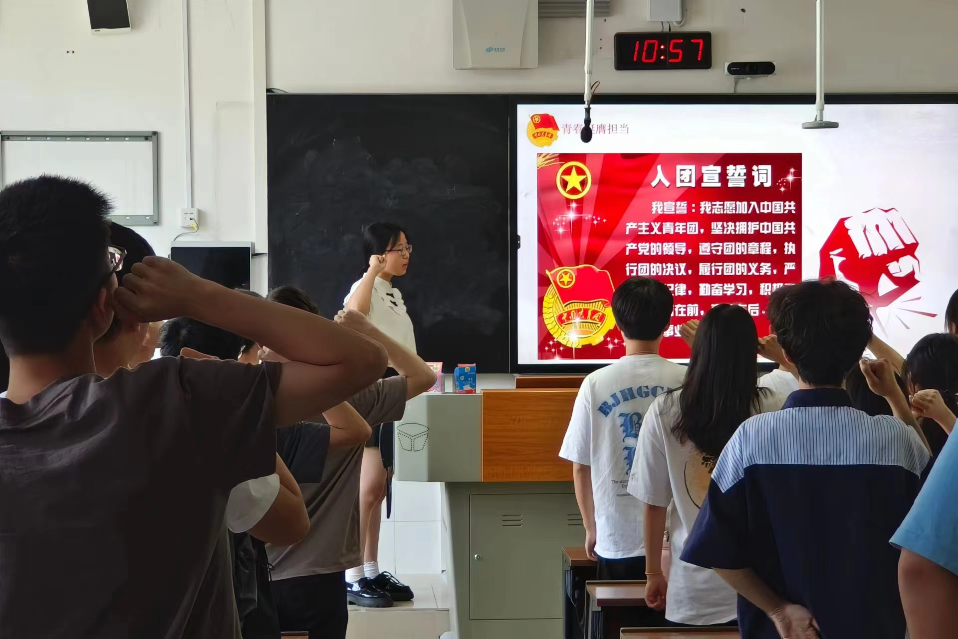活动正式开始之前,两个班联合开展了以“青年应注重个人发展还是社会责任”为主题的辩论赛,参赛选手们辩论激烈,引经据典、旁征博引,充分展示自己的才华和智慧。通过辩论,同学们明白了青年应该在追求个人发展的同时,不忘承担社会责任,实现个人与社会的共同发展。此外,贺婷通过幻灯片内容对活动进行总结升华,主要从新时代新青年为什么要奋斗,为谁而奋斗以及应该如何奋斗三个方面展开论述。活动尾声,贺婷带领团员重温入团宣誓词,敦促团员意识到自己的责任和使命,坚定信念,为团队的发展和进步贡献力量。