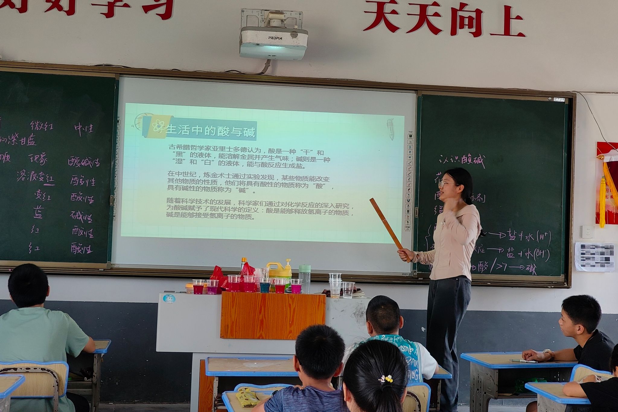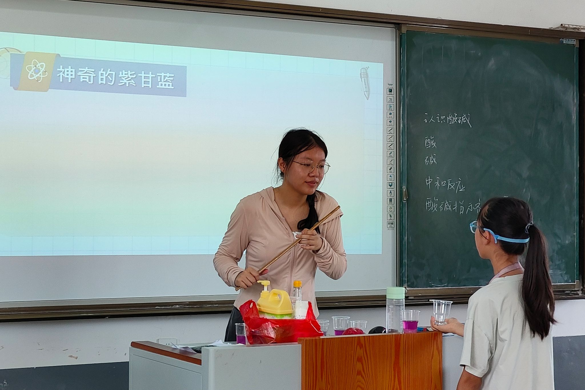 特色课程伊始,化学老师潘晗悦通过蝶豆花茶在碱性条件下变色的实验现象引入实验主题——认识酸碱指示剂。课程分为教师示范实验和员工实验两个部分。潘晗悦结合课程演示文稿和视频向同学们讲解了实验的具体流程,并进行了演示实验。第二部分,助教老师为同学们分发实验材料,带领同学们进行实验操作。每位同学都成功地完成了实验,观察到了变色反应现象。