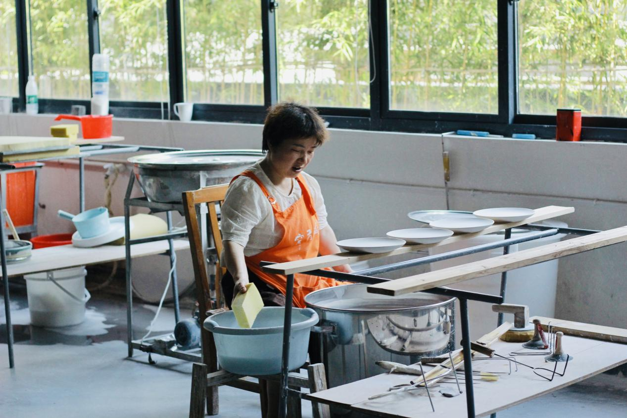 尚方窑瓷业有限公司工厂工作人员正在给瓷器上釉