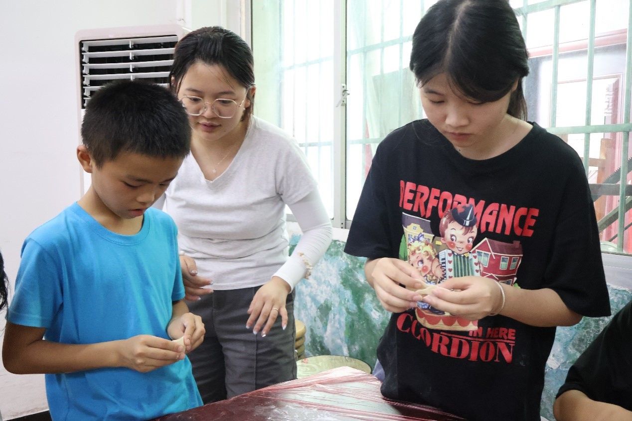 实践团成员正在指导员工包饺子