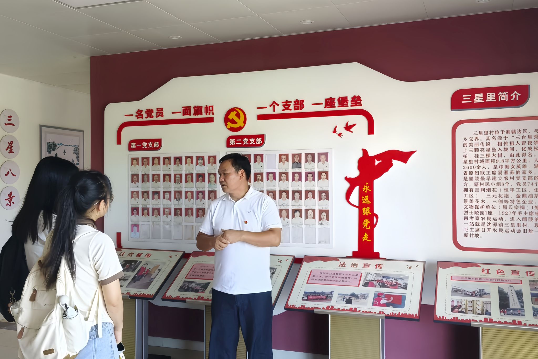 三星里村党支部书记易根接待了队员们。在易根的带领下,队员们参观了三星里村综合服务中心,并通过走访老党员、参观易氏宗祠和革命遗址,详细了解了三星里村“忠勇报国,耕读传家”的祖训家规与湖南农民运动事迹。随后,队员们来到三星里英雄烈士纪念园缅怀革命烈士,易根向队员们讲述了先烈事迹。队员们针对当地红色资源开发现状、村民对当地红色文化了解程度提出问题,易根逐一回答。他表示,醴陵市红色资源丰富,但亟待解决的问题是如何吸引更多年轻人参与到保护与宣传的工作中来。