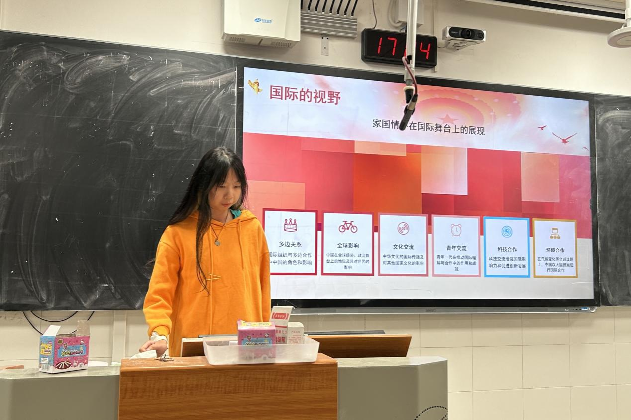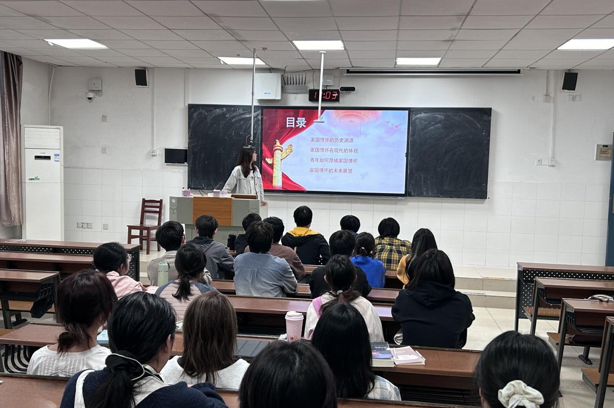 会议伊始,滑子曦通过讲解,图文并茂地展现国家情怀的历史渊源。随后同学们共同学习了习近平总书记金句中的重要指引并体会其深刻内涵。支部成员尹秋月结合自身学习、生活经历,上台分享了自己对“如何厚植国家情怀”这一观点的认识和理解,并讲述了自己对祖国的热爱与责任担当,进一步加深了同学们的思考。