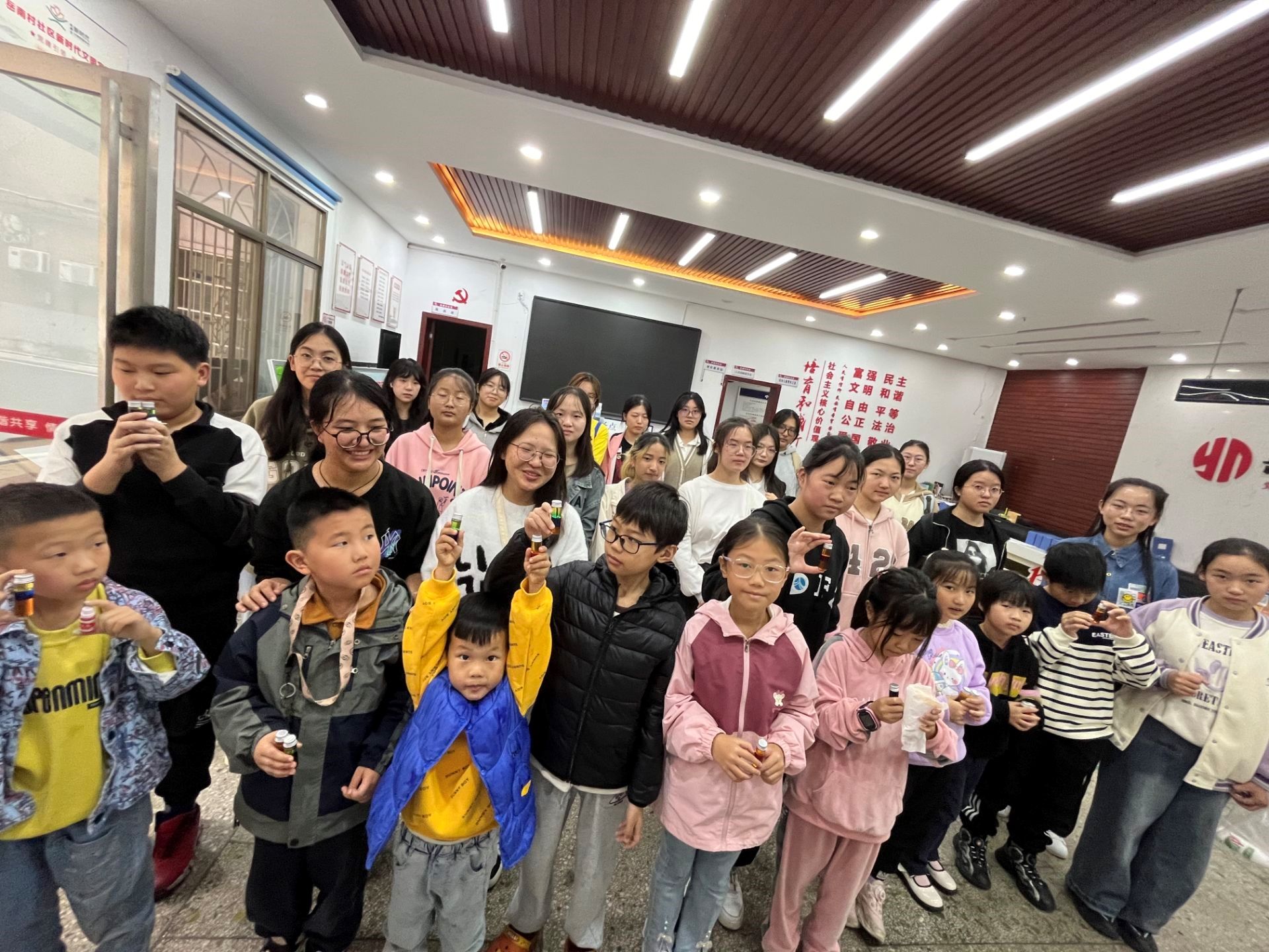 活动策划人周丽君根据小朋友人数将志愿者分成六组,每组两名小朋友,两名志愿者。由志愿者向珍梅为小朋友讲解小实验“魔法水”,两名小朋友在志愿者的帮助下共同完成一份小实验,观察到紫甘蓝浸泡过的水在不同pH条件的溶液中颜色发生变化;由周丽君为小朋友讲解小实验“彩虹杯”,每名小朋友做一份实验,小朋友在志愿者的帮助下将不同密度的液体倒入小瓶中;由志愿者朱苡萱为小朋友讲解小实验翻滚的“熔岩”,两名小朋友在志愿者的帮助下共同完成一份小实验,并且观察到翻滚的“熔岩”的实验现象。上午12时00分,活动正式结束,志愿者与小朋友们告别。