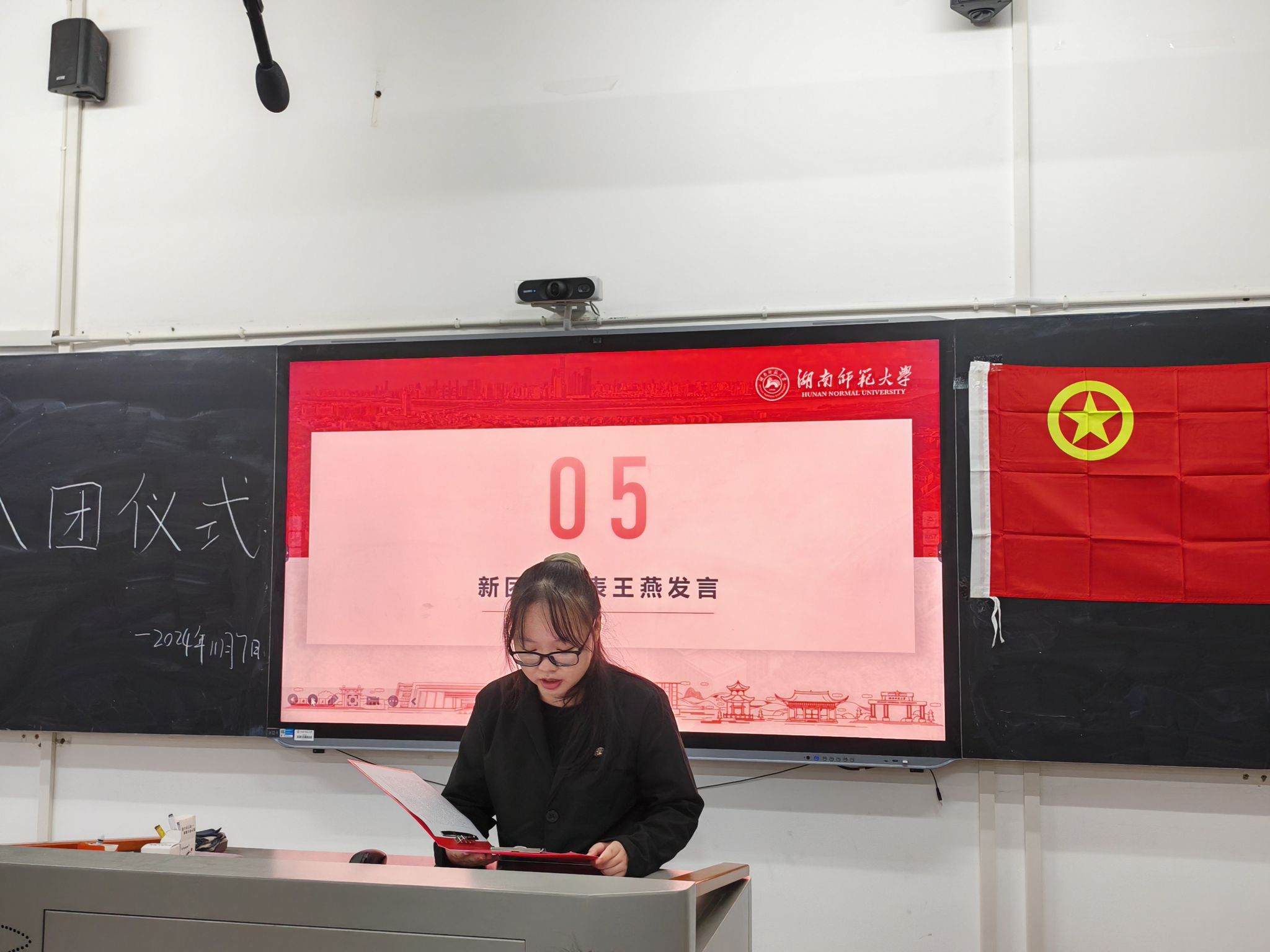 会议伊始,全体肃立奏唱国歌。陈秋潭宣布2024年新发展团员名单,新团员们依次上台,孙文涛与组织部负责人潘莎莎为新发展团员颁发团员证、佩戴团徽。宣誓环节,由新发展团员王燕领誓,新团员们面向团旗立正,举起右手并握拳,齐声跟读誓词。2205班王燕和2302班刘甜果分别作为新团员代表和优秀团员代表发言,她们表示今后将发挥团员的模范带头作用,在担当中历练,在尽责中成长,在新时代的广阔天地中施展抱负、顽强拼搏,为早日成为国家栋梁之材而奋发图强。孙文涛讲授主题团课,带领同学们深入了解共青团,他指出共青团是党的助手和后备军,要肩负起新时代新征程党赋予的使命任务,希望广大团员牢记入团誓词,坚定理想信念,做堪当民族复兴重任的奋斗者。入团仪式在全体新老团员齐唱团歌中落幕。