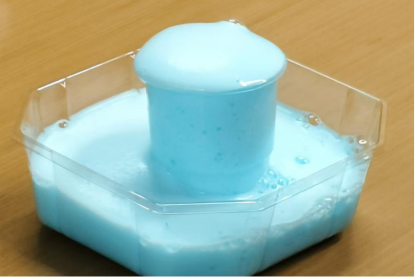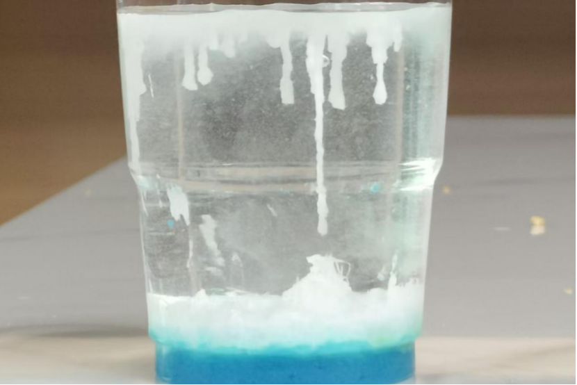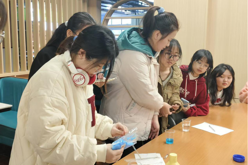 活动期间,会员们自行分组领取相关实验材料,在陈紫涵讲解完实验步骤和原理之后,会员们亲自动手操作,体验“蔚蓝海底”和“变色马卡龙”实验的趣味。在蔚蓝海底实验中,会员们先后将五水硫酸铜粉末和氯化钙溶液倒入配置好的硅酸钠溶液中,静置等待硅酸钙白色絮状沉淀生成,最后加入少许硫酸铜溶液。在变色马卡龙实验中,会员们选择喜欢的色素配置溶液,在溶液中加入洗洁精,小苏打和白醋,马卡龙色的泡沫喷涌而出。