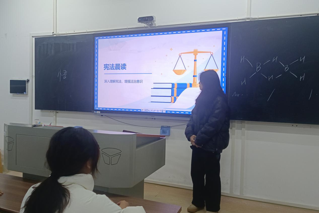 (通讯员 粟婷)12月6日晚,2303班于化工院117教室开展宪法晨读活动。此次活动由团支书肖嘉晴主持,2303班全体成员参加,旨在弘扬宪法精神,增强员工法治观念。