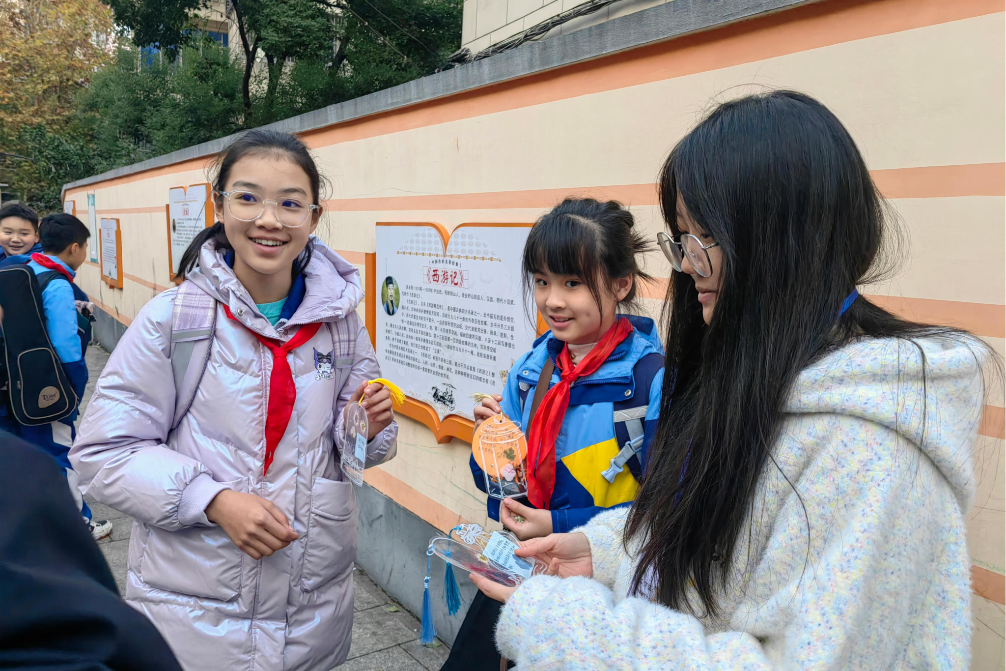 志愿者分发书签并传递新年祝福