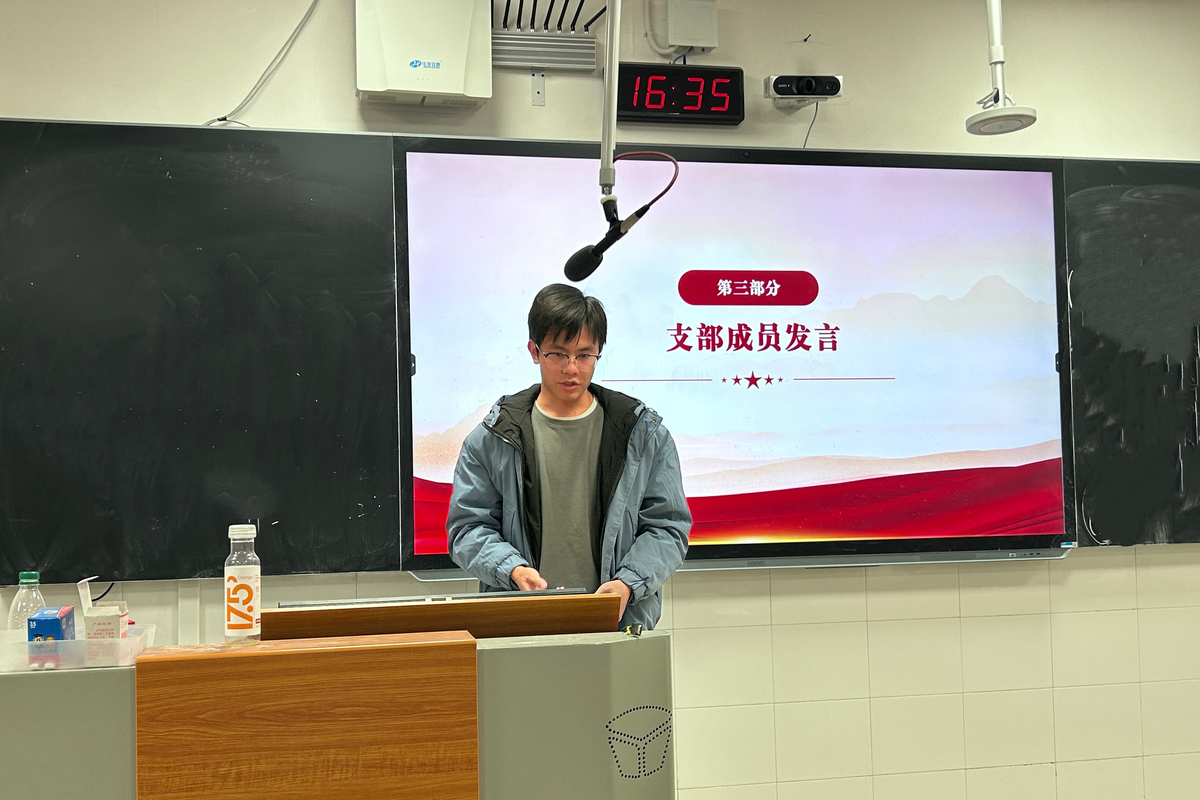 会议伊始,滑子曦带领大家学习了习近平总书记五四重要寄语精神等内容,针对支部委员任职情况做出深入客观的通报与反思,查找差距和不足。在团员自我评议环节中,每位支部成员依次上台对个人思想和活动参与情况等方面进行总结和汇报,以线下投票的方式,公平公正的选出较为优秀的团员。班导杨蓉对此次会议进行了点评,肯定会议的开展情况,同时对支部成员提出了一些建议。
