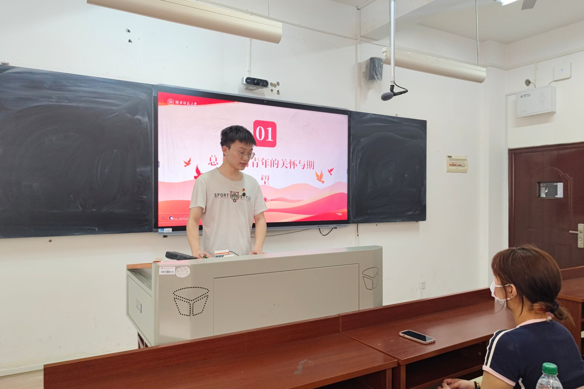 各部门工作汇报完毕后,主席团成员范俊进行春季思想培训会——《习近平与青年老员工》读书分享的汇报工作,他主要从习近平总书记对青年的关怀与期望、青年的使命与担当、如何读好“有字之书”和“无字之书”四个方面介绍如何为中国式现代化挺膺担当。