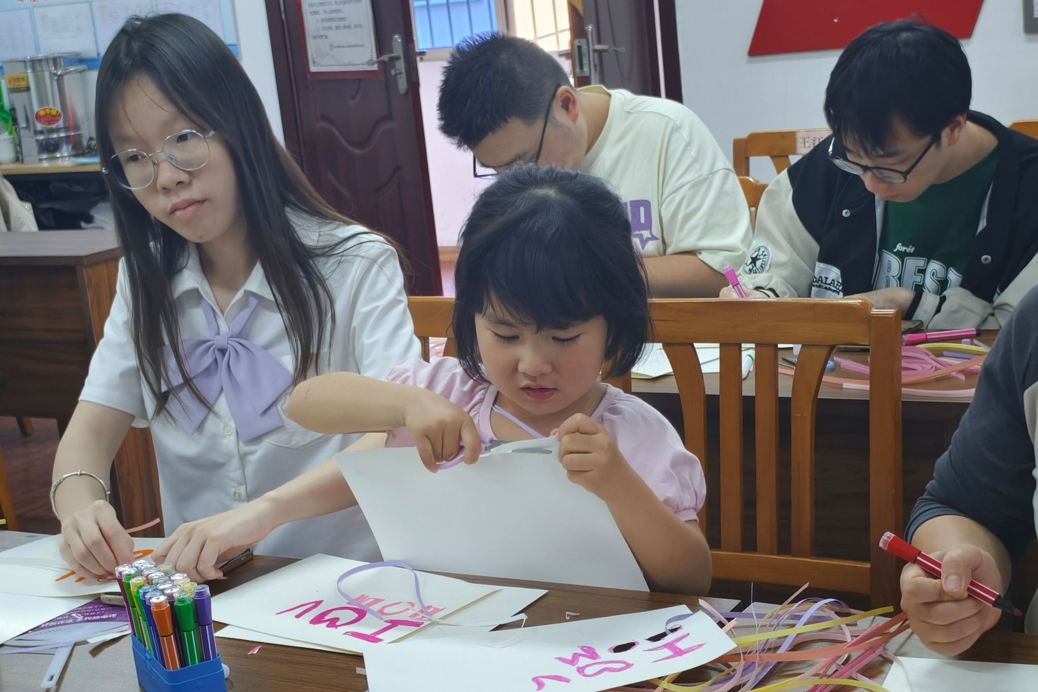 活动伊始,张梦心向会员和小朋友们介绍此次活动的主题,并介绍了衍纸贺卡的制作过程。活动现场,会员和小朋友们发挥奇思妙想,利用衍纸的各种基础卷型创作出蝴蝶、花朵和爱心等形状,借此表达对母亲的爱和赞美。在家长们和会员们的耐心指导下,一张张承载着家人温暖与爱意的贺卡在小朋友们的手中诞生。活动最后,小朋友们和会员们一起合影留念,记录下这一愉快的时刻。