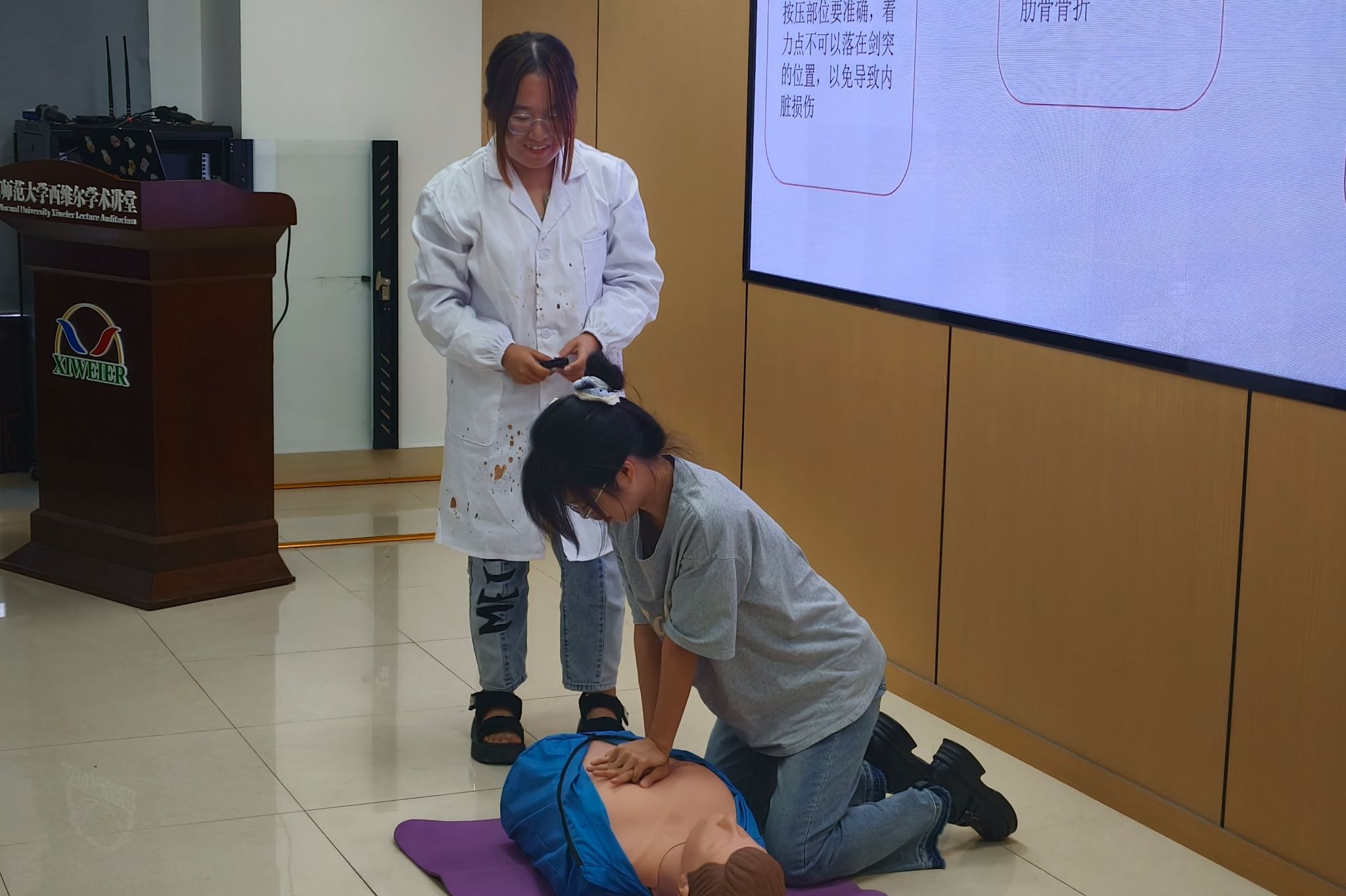 活动伊始,2024年“三下乡”优秀实践团队代表代表蔡紫婧、韩雱朵、刘雅凯三人结合自身经历,分别从项目申报、宣传调研、教学任务等方面向同学们传授了经验。前社会实践部负责人潘楚楚对“三下乡”活动细则以及奖项进行介绍与解读,鼓励同学们坚持“做有所成”,尽力取得更为丰富的实践成果。医公司讲师团为同学们带来一堂实用而重要的“生命必修课”,此次课堂不仅讲解了心肺脑复苏等急救知识,更进行了生动的现场操作演示。互动环节,员工代表在讲师指导下亲手体验了CPR操作流程,让安全技能从理论走向实践。活动尾声,唐健清做总结发言,他提出各队伍要扎实开展特色主题活动,鼓励同学们以积极乐观的态度投入此次“三下乡”活动,同时提醒各位同学务必提高安全意识和自我保护意识,在实践中锻炼自我,提升能力。