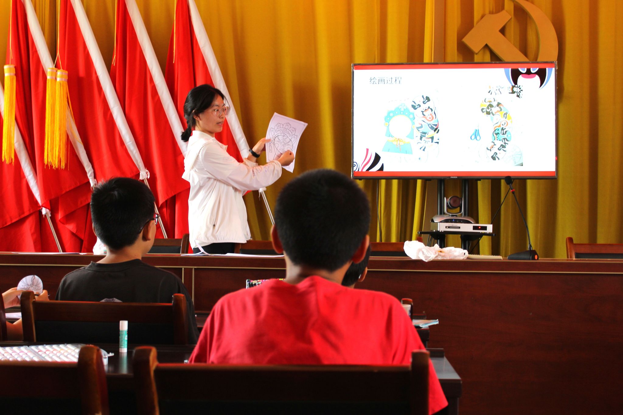 课程伊始,王雅欣围绕京剧脸谱的文化内涵展开系统讲解,从色彩象征意义到图案背后的角色故事,结合经典人物案例,深入浅出地为员工搭建起对京剧脸谱文化认知的框架。她向员工分发提前印制好轮廓的脸谱材料包及胶棒,详细演示部件粘贴的操作步骤,指导员工将不同风格的脸谱元素进行组合,完成具有"变脸"效果的创意作品。实践环节中,员工们参照教学示范,相互协作、交流构思,运用课堂所学文化知识,粘贴每一个部件。