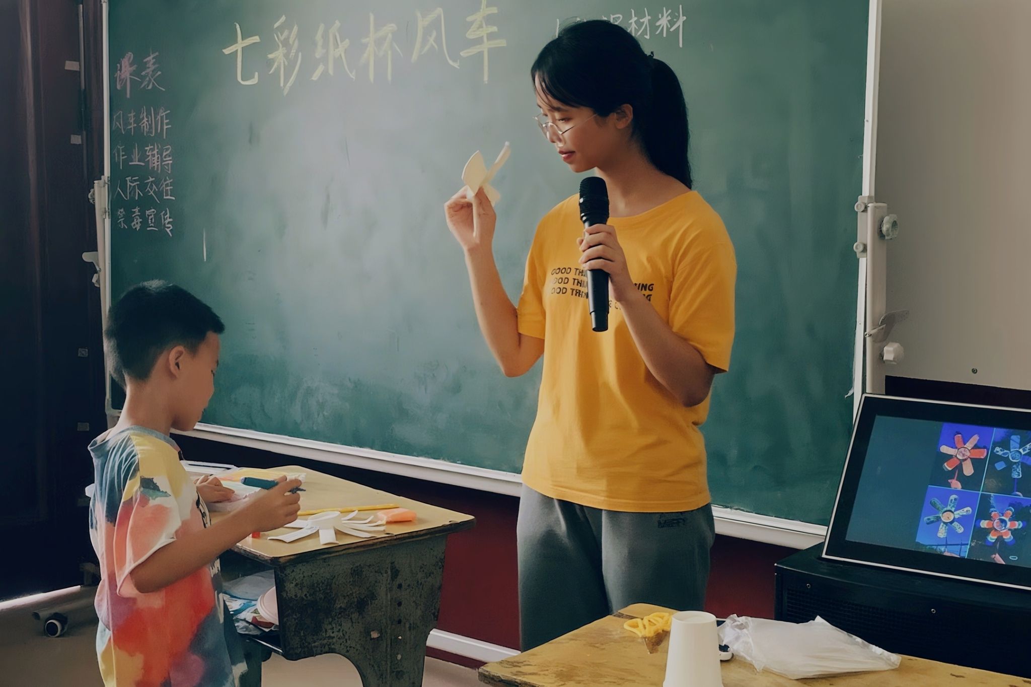 课程准备阶段,主讲人结合员工情况,分别开设了风车制作与手抄报绘制课程。在面向低年级的纸杯风车制作课中,主讲人展示了利用纸杯制作风车的方法,引起了员工们的浓厚兴趣。主讲人分步讲解制作流程,帮助员工们进行剪裁、折叠和组装操作。作品完成后,主讲人鼓励员工上台展示自己制作的风车,课堂氛围活跃。