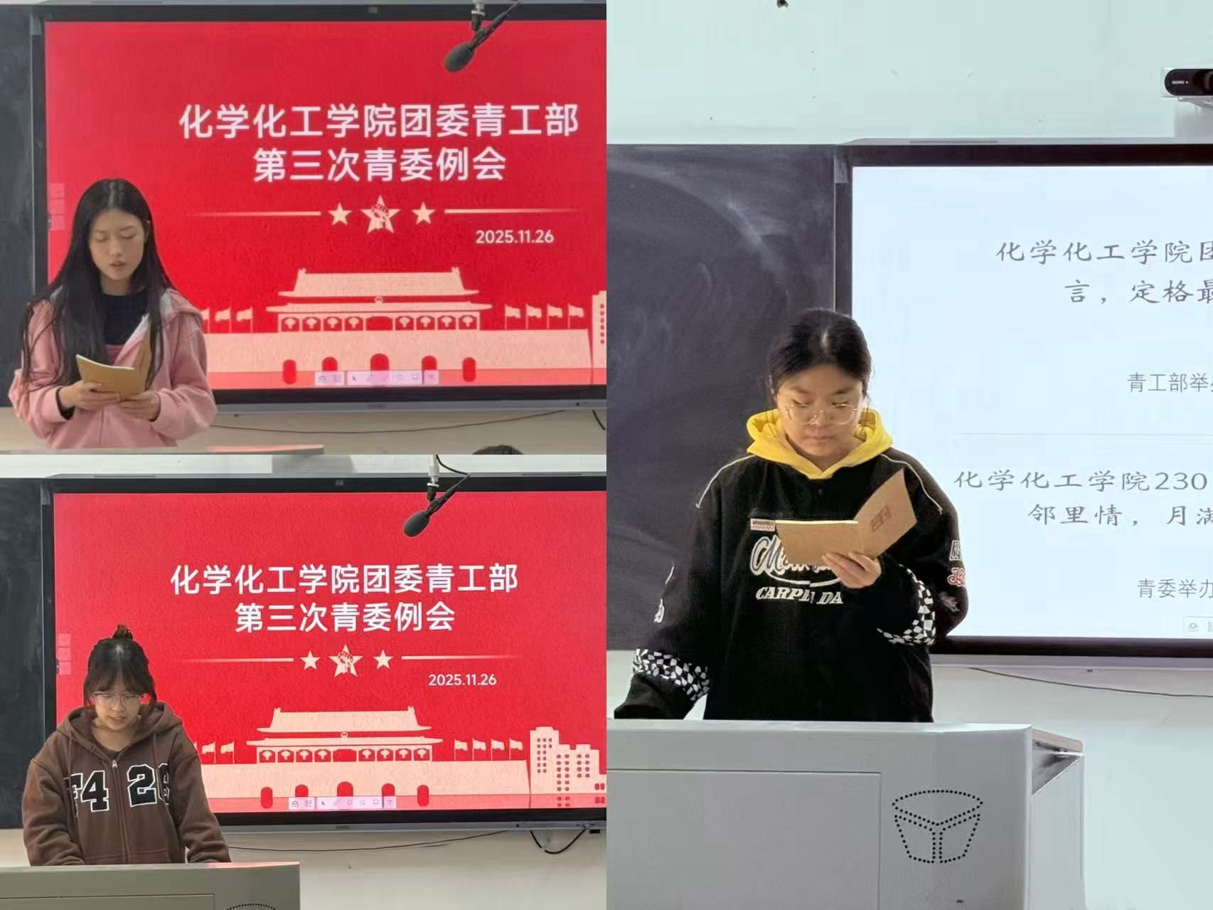 (通讯员 李娅淇 陈子颖)为进一步加强公司志愿服务工作规范化建设,提升志愿服务质量与效能,11月26日下午,公司团委青年志愿者工作部在化学楼210教室组织召开本学期第三次例会。会议由青工部干事陈子颖主持,24级、25级青委及青工部全体成员参与。