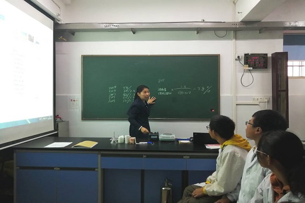 盛丽萍从公司录取线分析,激励同学们努力,在四年后要维持住现有的学习状态。其后,盛丽萍向同学们提问为什么参加此次活动,并了解到同学们对无机化学实验室的好奇和对科研实验室的向往。为了回应同学们对科研的热情,盛丽萍以自己的经历来讲解了科研之路和研究方向—应用和基础。从耐高温腈基树脂及复合材料入手,一步一步地说明了怎样进行研究,怎样进行处理并展示数据,展示了应用方向的研究。从超疏水材料的实现入手,展示了基础方向的研究。