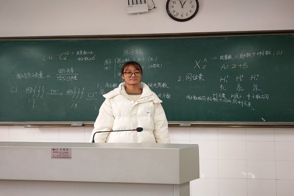 在笔试成绩出来之后,通过笔试的同学被重新分为了三组,以更加严格的要求开展了接下来的活动。首先,杨蛟婕给同学们讲了面试报名及缴费截止时间,提醒同学们要及时确认报名成功,随后还给同学们讲述了《湖南2018年下半年中小学教团队格证考试(面试)公告》中的内容,带领大家熟悉面试流程。活动正式开始,在此次活动中,小组成员杨晨、肖佩捷、黄静、翦华圣、杨蛟婕、李艳芳、贾英华依次登台进行了讲课。杨晨同学为大家讲授了酯化反应,肖佩捷讲授了金属腐蚀,黄静讲授了原子核的内容,翦华圣讲授了甲烷,杨蛟婕讲授了原电池的原理,李艳芳讲解了电解池的原理,贾英华讲授了金属的化学性质。小组成员授课完毕后,杨蛟婕对大家的授课进行了点评,并通知了下次活动的安排。