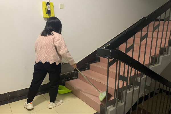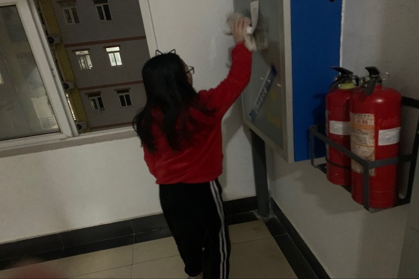 活动伊始,尹吕樱子调查天马五栋的垃圾分布后,在班级通知群发布活动消息,招募志愿者,然后进行人员分布。志愿者自行准备好扫把,簸箕和抹布等打扫工具,将天马五栋的七个楼层的台阶,扶梯,窗户和消防栓全部进行了打扫和擦拭,并将公寓垃圾进行清理。活动过程中,志愿者们积极参与,认真打扫。