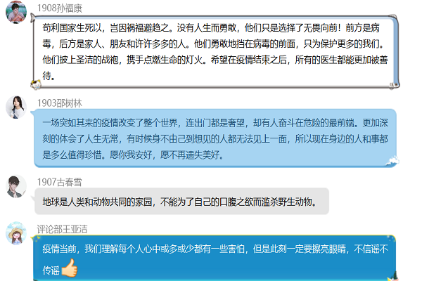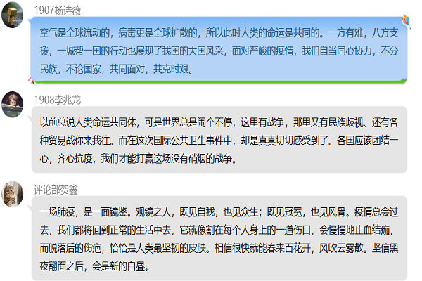此次评论活动让敬畏自然、尊敬科研人员和医护人员的观念更加深入人心,提高了同学们遇事理性思考的意识,同时也增强了同学们的忧患意识和责任感。