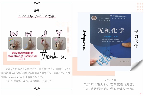 在三月这个春暖花开的季节,恰逢遇到全民共同战疫的时期,为了让同学们心中对同学、朋友的思念也得以表诉,化工院员工会女生部发布活动通知要求以及给同学们提供一些合拍模板,同学们积极报名参加,在收集完所有报名材料后,员工会外宣部对材料进行微信推送的编辑,并发布微信推送让同学们转发投票,票选出12组人气小组之后由女生部进行最后的评分择优,最终公布前五名的小组结果。