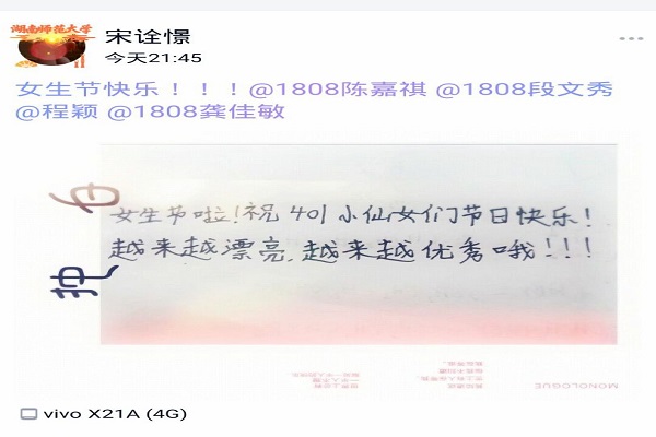 活动前期,唐泽兰组织男生准备好对1808班女生的祝福语。活动期间,男生们在纸上写下自己的祝福语,虽受疫情影响,贺卡未能转交到班级女生的面前,但男生们在线上编辑说说,表达对班级女生的祝福。