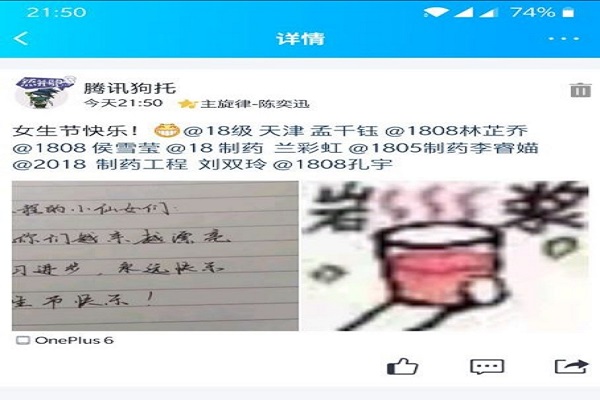 (通讯员 秦静怡)3月20日下午19时,女生兼心理委员唐泽兰组织1808班全体同学开展女生节线上特别活动之“你是我女神”。