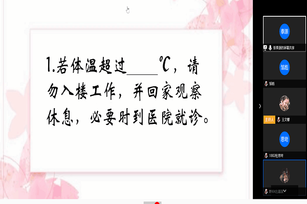 会议在主持人张泰源致开场词后正式开始,全体成员庄严奏唱团歌。随着团歌的缓缓结束,各小组以“团结一心齐奋进,风雨定能送春归”为主题,分别结合自己家乡在疫情期间所开展的防疫举措,并以PPT,视频等多种形式对疫情相关热点时事进行评析。之后,主持人张泰源组织学员们进行了疫情知识竞答比赛并播放了由团校成员制作的家乡版“为中国加油”视频。视频中,学员们都用家乡话为祖国送上了最诚挚的祝福,共同祝愿疫情早日结束,迎接春暖花开。会议最后,由团校秘书长王文馨向成员们介绍了团校学习的相关细节以及团校结业的要求。