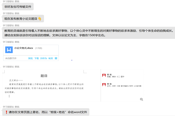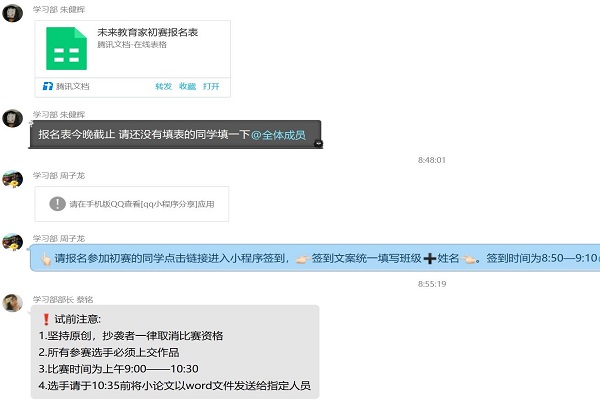 此次线上比赛参赛人员由17级全体师范生、部分17级非师范生和部分18级同学组成。为保证线上比赛的公平公正,此次比赛严格按照比赛流程进行:八时五十分各位参赛选手在相应的QQ群进行签到;九时发放教育论文主题;十时三十分论文撰写结束;十时三十五分前参赛选手上传论文;初试作品由公司老师和往届获奖选手在未知作者信息的情况下进行评分。