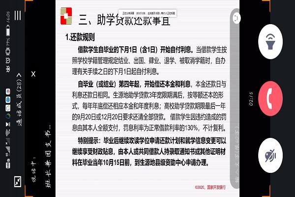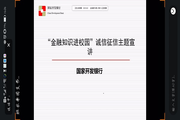 孔宇向大家介绍了湖南分行国家助学贷款的开展情况,而后又指出了助学贷款相关还款事宜,其中包括还款规则、还款方式及还款的时间节点。孔宇着重向大家介绍了逾期还款会引起的后果,如果未按期足额偿还借款等情况,逾期记录将载入个人征信系统。每逾期一个月为逾期一期。逾期记录可能会影响、限制办理信用卡、住房贷款、购车贷款等。