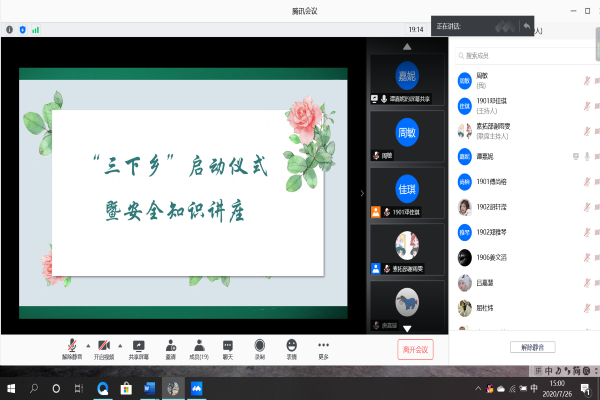 (通讯员 周敏)7月26日15时,2020年三下乡启动仪式暨安全知识宣讲会于腾讯会议举行。院团委书记屈杜炜、学工办2017级辅导员付玉丽和2018级辅导员杨魏鹏、院团委员工副书记赵韩、医公司主讲团以及2020年三下乡暑期实践队伍全体成员参与此次会议。此次会议由院团委素质拓展部成员谭嘉妮主持。