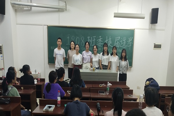 孔宇对1808班上一届班委的工作结果进行总结,并回顾了同学们在上一学年的出彩表现。总结结束后,各个班委顺序发言,表达了自己工作的心得和体会以及对同学们的感谢,鼓励同学们担任新任班委。随后新任班委通过同学们的投票竞选上任,新人班长兼团支部副书记蔡子浮 表示会努力建设班集体,增强集体荣誉感,号召同学们团结一致为班级建设添砖加瓦。