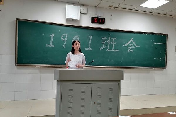 高丽发表讲话,对1901班上一年的成绩进行总结,讲解了有关综测评选的事宜,并对新学年的班级发展做出新的要求。