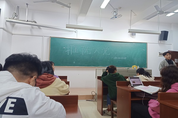 余益根向同学们介绍党的红色章程和光荣历史,汇报候选人基本情况。候选人依次进行自我陈述,讲述自己对党的了解和觉悟。同学们对候选人提问并进行无记名投票,最后现场唱票、公布票数。本次推优入党的同学有:王鹏辉、肖顺辉、尹德文、尹吕樱子、袁灿辉。