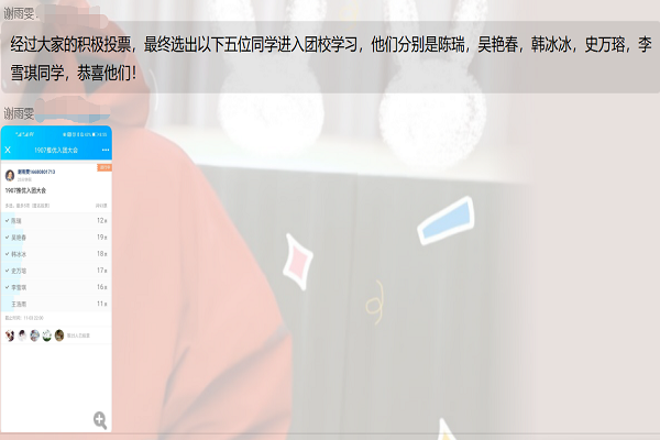 活动开始,谢雨雯介绍了推优入团的意义以及重要性,竞选同学按照顺序依次发表竞选宣言表达自己对于团校的理解与认识。谢雨雯组织同学们进行了差额投票选举并统计结果,最终决定了五名同学进入团校学习,他们分别是陈瑞,吴艳春,韩冰冰,史万瑢,李雪琪。