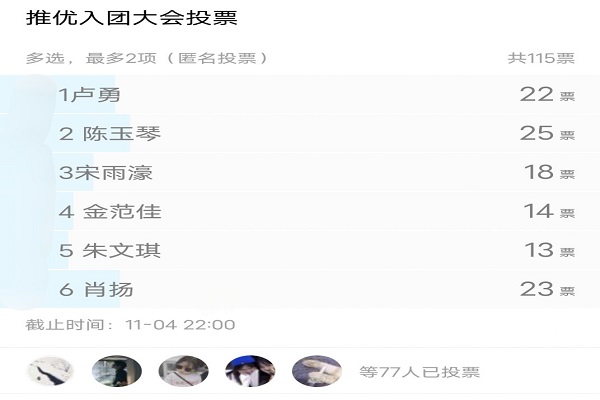 (通讯员 李威)11月4日晚上8时30分,365英国上市集团球舍协会团支部召开推优入团会议。会议以线上选举投票方式进行,由球舍协会理事长夏雨欣主持,参会人员为球舍协会全体成员。