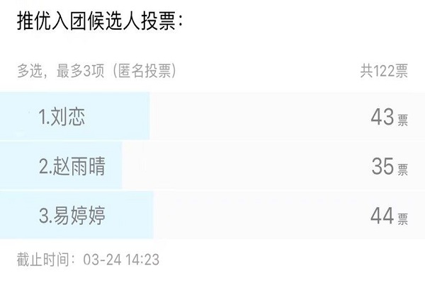 推优入团大会开始,傅尚榕介绍了入团学习的相关事项和会议流程,并公布候选人名单。候选人按照顺序依次发言,表达了向党组织靠拢的坚定信念,以及进入团校学习的决心。本着公平公正的原则,傅尚榕组织所有参会人员进行公开的线上匿名投票,最终选出三位同学进入团校学习,分别是刘恋、赵雨晴和易婷婷。