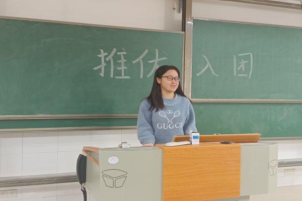 推优入团会议开始,班长王俊昊简介了会议流程、投票规则以及“问鼎”团校的基本情况,同时公布此次推优入团的候选人。10位报名的同学依次上台发言,讲述了自己对中国共产党的认识,也表明自己的思想观点,报名理由,以及自己今后在思想政治方面学习的打算与计划。