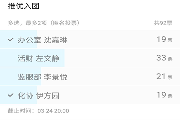 会议开始,杨翠文简单介绍了此次推优入团会议的相关流程,各位候选人依次发言,讲述他们的入团理由并表明进入团校学习的决心。所有候选人发言完毕后,杨翠文组织参会人员进行线上匿名投票,最终选出左文静、李景悦两位同学进入团校学习。