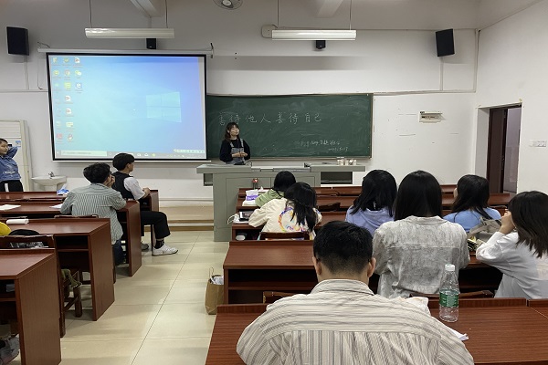 活动伊始,贺玉芳结合班集体的一些实际情况引出“善待他人,善待自己”主题,组织同学们回忆、分享在面对挫折与困难时的态度和解决方法。贺玉芳帮助自我矛盾的同学正确思考问题,我们的思想、行为都受环境的影响,所以说善待他人等于善待自己。